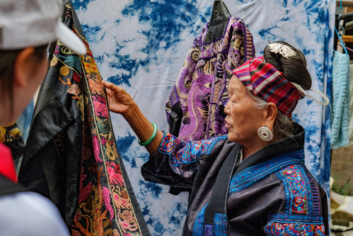 “苗族人绣的都是故事,苗族文化是财富,是宝贝。”潘玉珍热情地向团队成员展示了部分苗绣作品。精美纹样背后的故事随讲解缓缓展开,纪录着苗族文化独特的神话传说,传承苗族人民的世界观与智慧。潘玉珍多次受邀将向世界展示苗绣,曾前往新加坡、美国、英国……她不断将苗绣传统文化带上世界舞台。