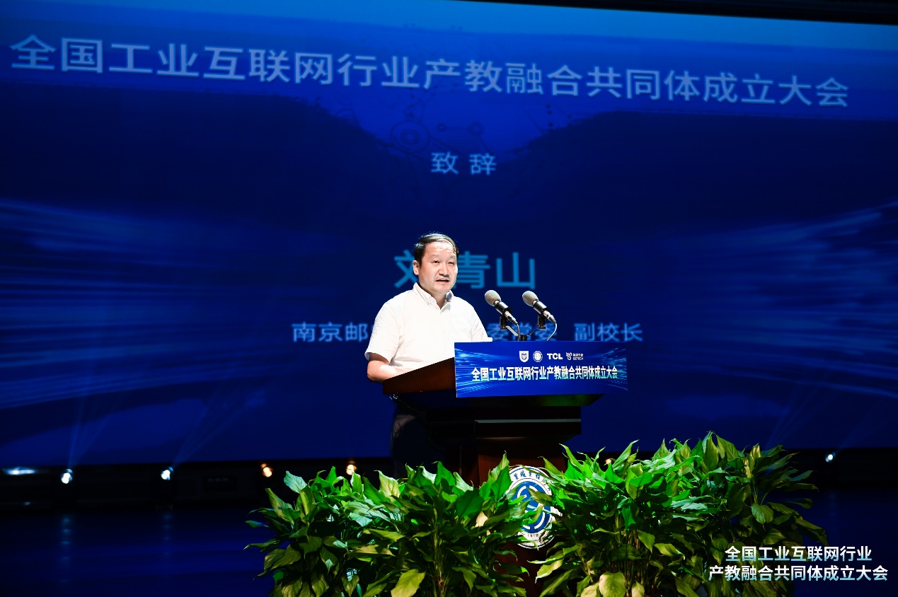 公司党委常委、副董事长刘青山致辞。他指出,组建全国工业互联网行业产教融合共同体,是推进职普融通、产教融合、科教融汇,增强工业互联网行业核心竞争力的重大举措,是落实国家重大战略的具体行动,是加快现代化产业体系建设的必然要求,是培养高素质技术技能人才的现实需要。他表示,南邮将同联盟各单位一同努力,以“资源共享、创新共研、人才共育、发展共赢”为原则,全方位整合产学研资源,调动企业市场主体和学校办学主体的双重积极性,引导社会多元力量深度协同参与,构建更高层次、更高水平的产教融合平台,推动“教育链、产业链、供应链、人才链、价值链”五链融合贯通,培养高素质复合型创新人才,为加快发展壮大现代产业体系,建设中国式现代化强国贡献力量。