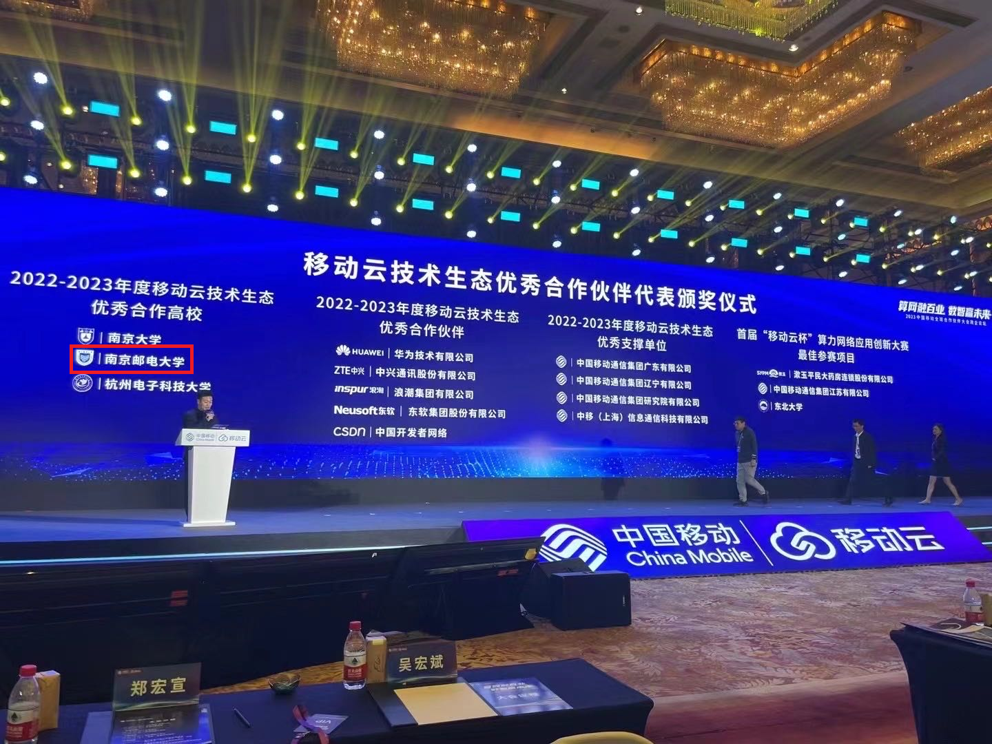 公司丁飞教授代表出席政企论坛,获颁2022-2023年度移动云技术生态优秀合作高校,同时获得该荣誉的有南京大学、杭州电子科技大学。
