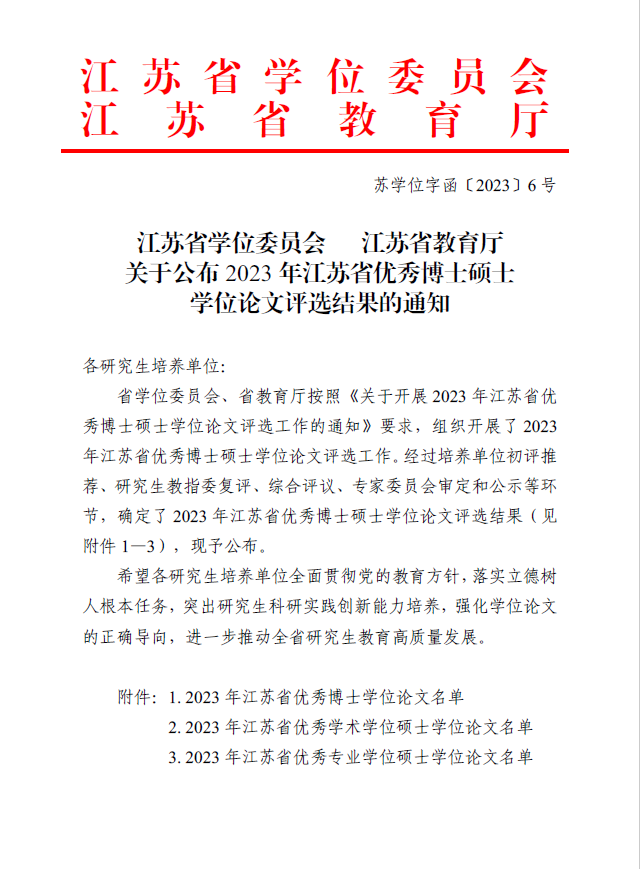 江苏省优秀博士硕士学位论文由省学位委员会组织评选,每年评选一次。各培养单位根据《关于开展2023年省优秀博士硕士学位论文评选工作的通知》要求,每个学位点择优推荐1-2篇,经培养单位初评推荐、省研究生教指委复评、省教育评估院综合专家组评议、省学位办专家委员会审议、网上公示等环节,2023年全省共评选出优秀博士学位论文200篇,优秀学术学位硕士学位论文250篇、优秀专业学位硕士学位论文250篇。